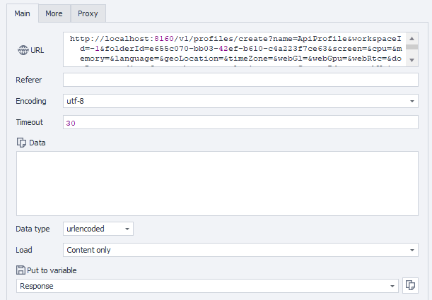 curl 'http://localhost:8160/v1/profiles/create?name=ApiProfile&workspaceId=-1&folderId=&screen=&cpu=&memory=&language=&geoLocation=&timeZone=&webGl=&webGpu=&webRtc=&domRect=&audio=&fonts=&battery=&plugins=&proxyServerId=&speechVoices=&cookies=¬es=&tags=' \